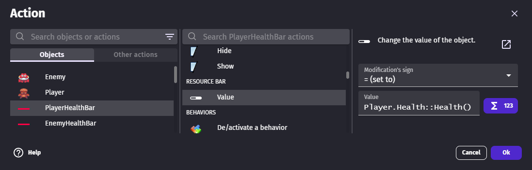 The "Value" action allows to change the value displayed by the bar. Here, the bar value is set to the player health using the Health behavior.
