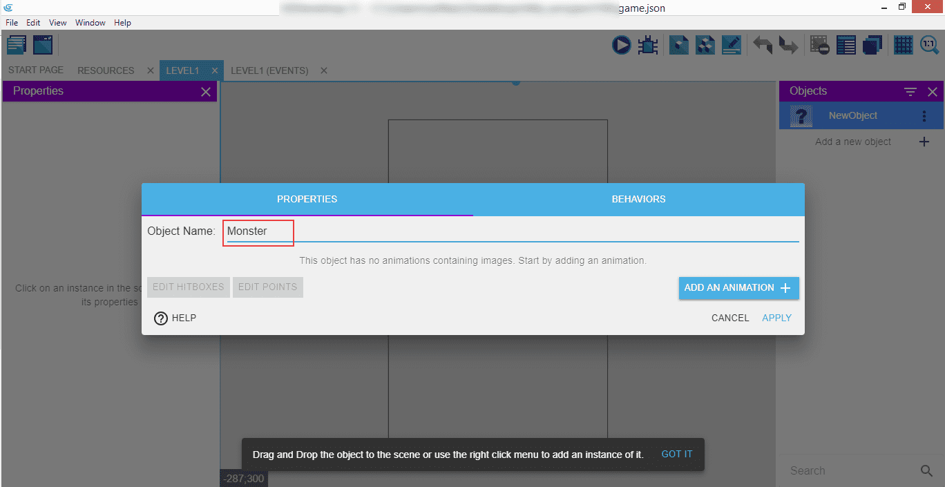 Another popup will appear, but now with the options to customize our new object. We will call him "Monster", and he will be our main character in the game: collecting items and being cute at the same time.
