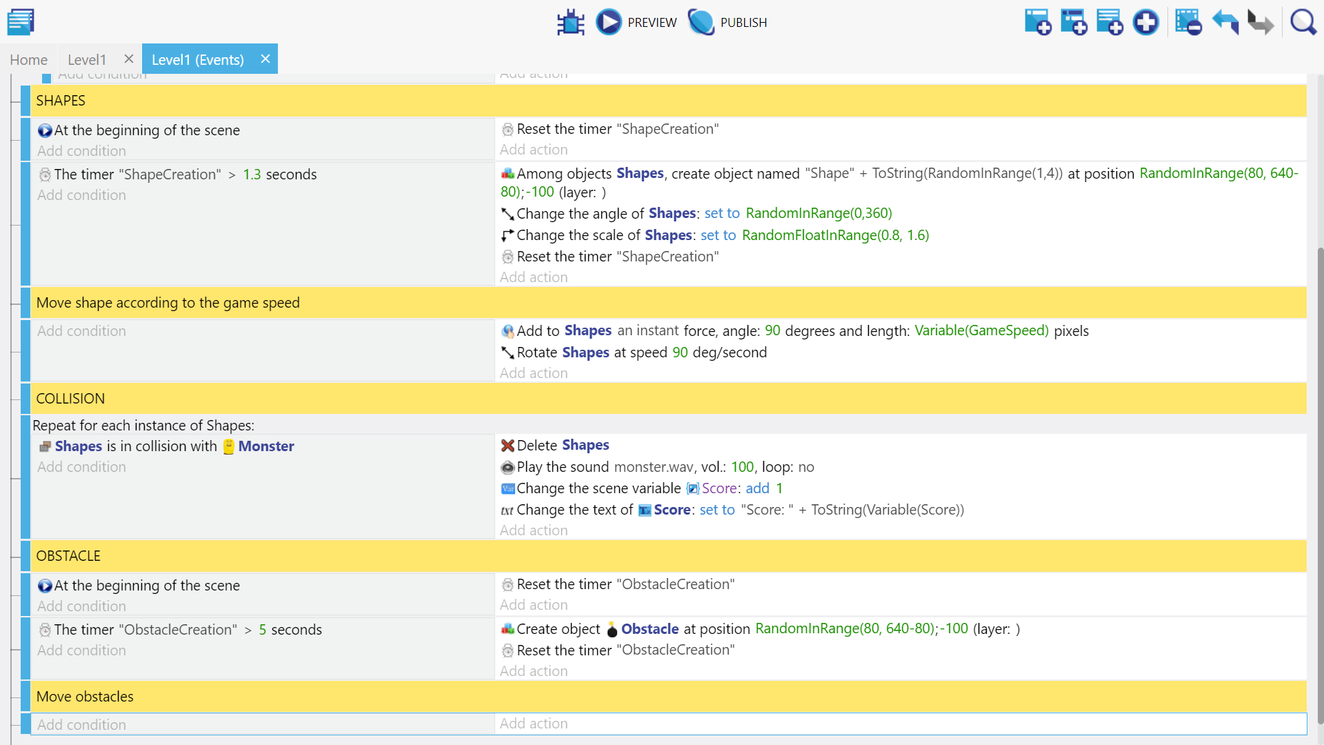 Next create a new event above the obstacle event and give it the condition “at beginning of the scene”, and copy/paste the earlier create “Start (or reset) a scene timer” action for “ObstacleCreation” to this new event. This will start the timer at the beginning of the game in so the obstacle event will trigger the first time.